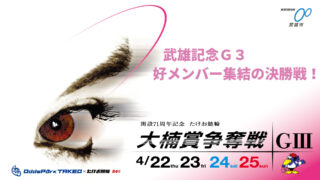 松浦悠士の優勝で幕を閉じた武雄記念が終了し、次回のG3開催は4月29日(祝・木)から奈良競輪場で開催される「施設整備等協賛競輪・秋篠賞」。日本選手権直前でSS不在となり、傑出者不在の大混戦となりそうだ。どうぞお楽しみに。