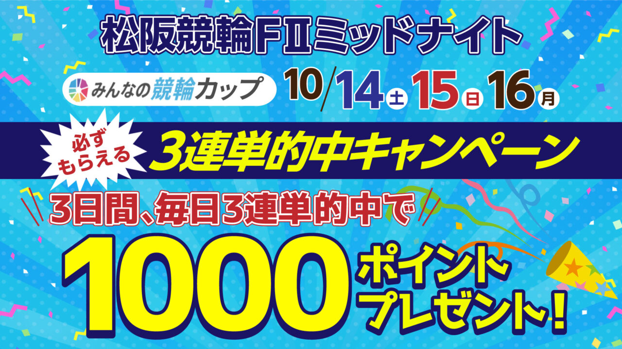 【自動エントリー】3日間毎日3連単的中でポイントプレゼント!『松阪競輪F2ミッドナイトみんなの競輪カップ 投票キャンペーン!』(10/14~10/16)